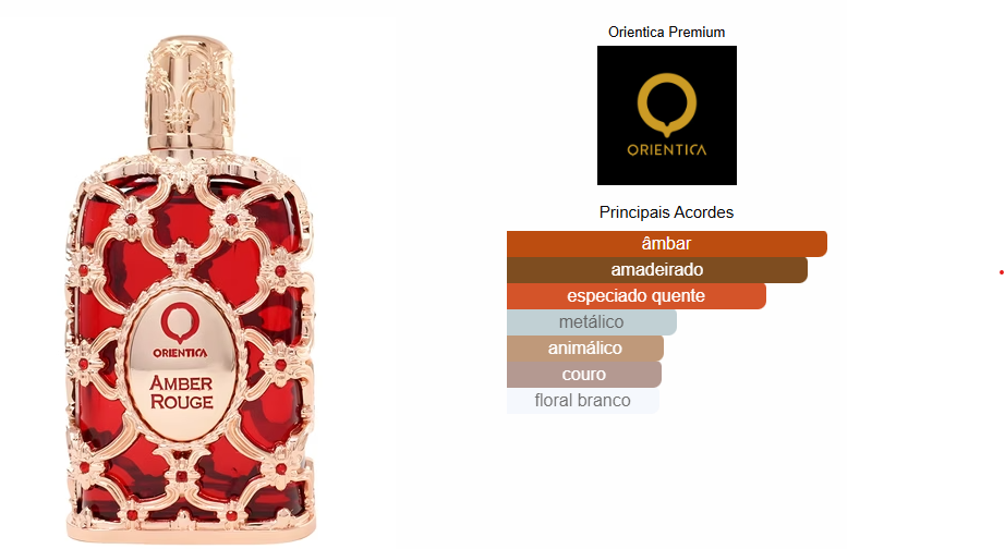Amber Rouge de Orientica Premium é um perfume Amadeirado Especiado Compartilhável. Amber Rouge foi lançada em 2021. As notas de topo são: Açafrão e Jasmim. As notas de coração são: Madeira de Âmbar e Âmbar Cinzento. As notas de fundo são: Cedro e Resina de Abeto.