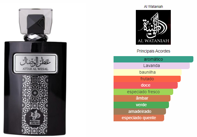 Attar Al Wesal de Al Wataniah é um perfume Âmbar Especiado Compartilhável. Attar Al Wesal foi lançada em 2020. As notas de topo são: Pera, Lavanda, Hortelã, Bergamota e Limão. As notas de coração são: Canela, Sálvia Esclaréia e Cominho. As notas de fundo são: Casca de Baunilha Negra, Âmbar, Cedro e Patchouli.