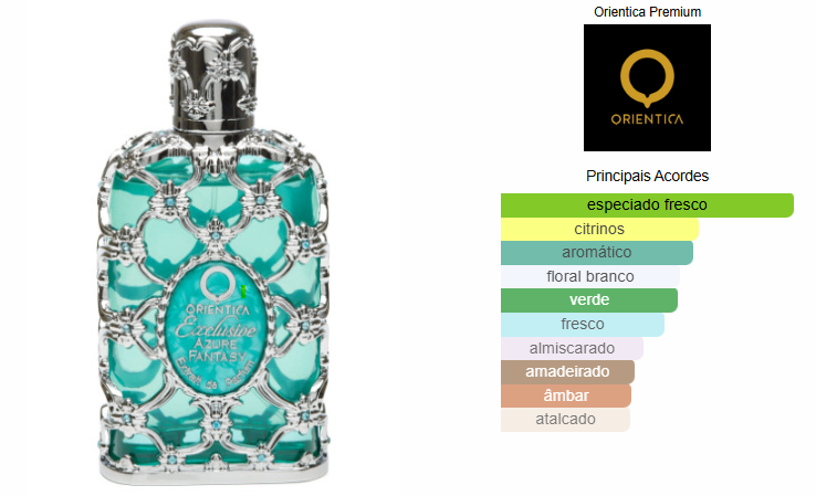 Exclusive Azure Fantasy de Orientica Premium é um perfume Compartilhável. Esta é uma nova fragrância. Exclusive Azure Fantasy foi lançada em 2024. As notas de topo são: Bergamota, Gengibre, Hortelã e Noz-moscada. As notas de coração são: Lírio-do-Vale, Gerânio e Jasmim. As notas de fundo são: Almíscar, Âmbar Cinzento e Madeira Guaiac.