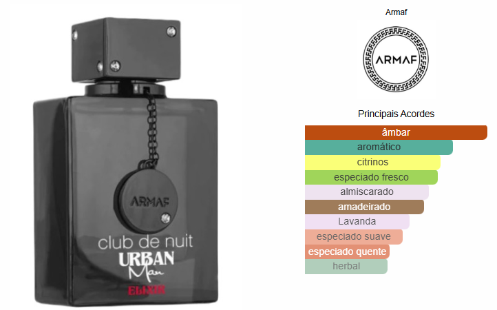 Club De Nuit Urban Elixir de Armaf é um perfume Masculino. Esta é uma nova fragrância. Club De Nuit Urban Elixir foi lançada em 2022. As notas de topo são: Bergamota, Pimenta Rosa, Flor de Laranjeira e Jasmim. As notas de coração são: Lavanda, Elemi, Gerânio, Vetiver, Açafrão e Tagetes. As notas de fundo são: Ambroxan, Âmbar, Cedro, Patchouli e Ládano.
