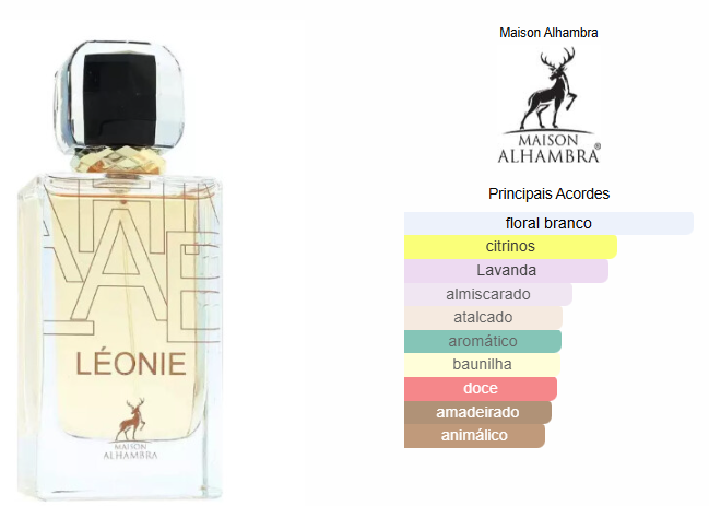 Léonie de Maison Alhambra é um perfume Âmbar Fougére Feminino. Léonie foi lançada em 2022. As notas de topo são: Lavanda, Tangerina, Petitgrain e Groselha Preta. As notas de coração são: Jasmim, Lavanda e Laranja. As notas de fundo são: Baunilha, Almíscar, Âmbar Cinzento e Cedro.