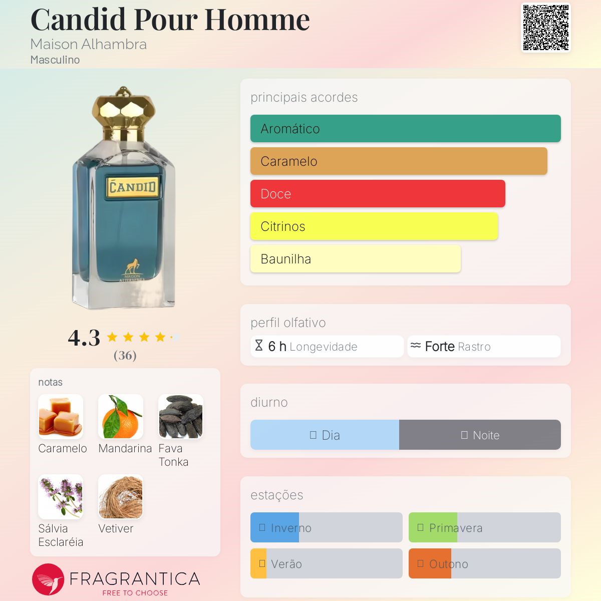 So Candid de Maison Alhambra é um perfume Oriental Fougére Masculino. Esta é uma nova fragrância. So Candid  foi lançada em 2024. As notas de topo são: Mandarina e Sálvia Esclaréia. As notas de coração são: Caramelo e Fava Tonka. A nota de fundo é Vetiver.